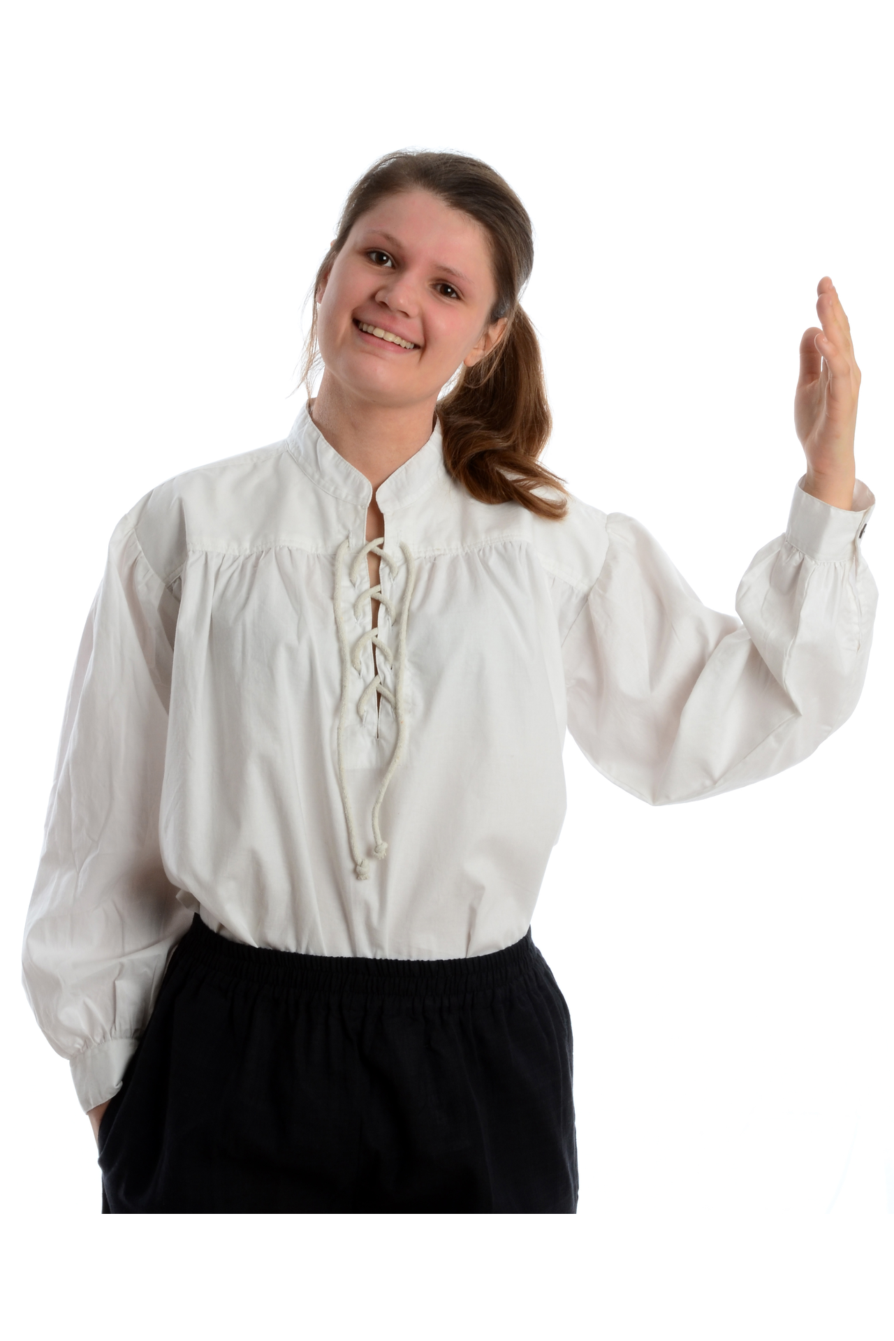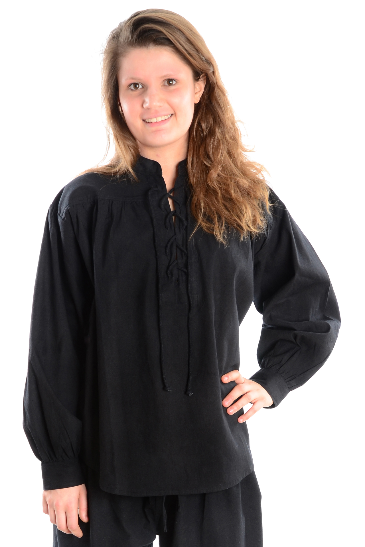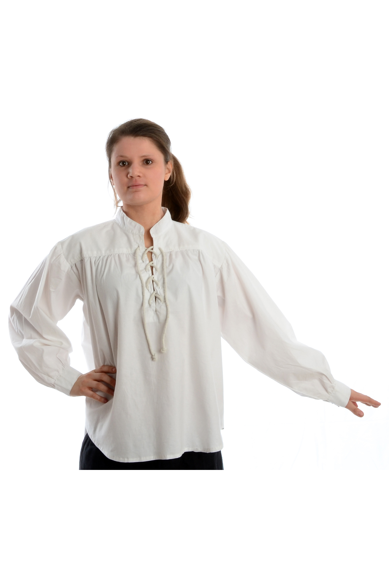 Medieval lace-up blouse loose fit and long puffed sleeves made of thin fabric. The Blouse Ortrun is available in the colors white and black and the sizes S, M, L, XL, XXL and XXXL. The item is made of cotton and machine washable at 40°C. The Medieval blouse comes without accessoires.
