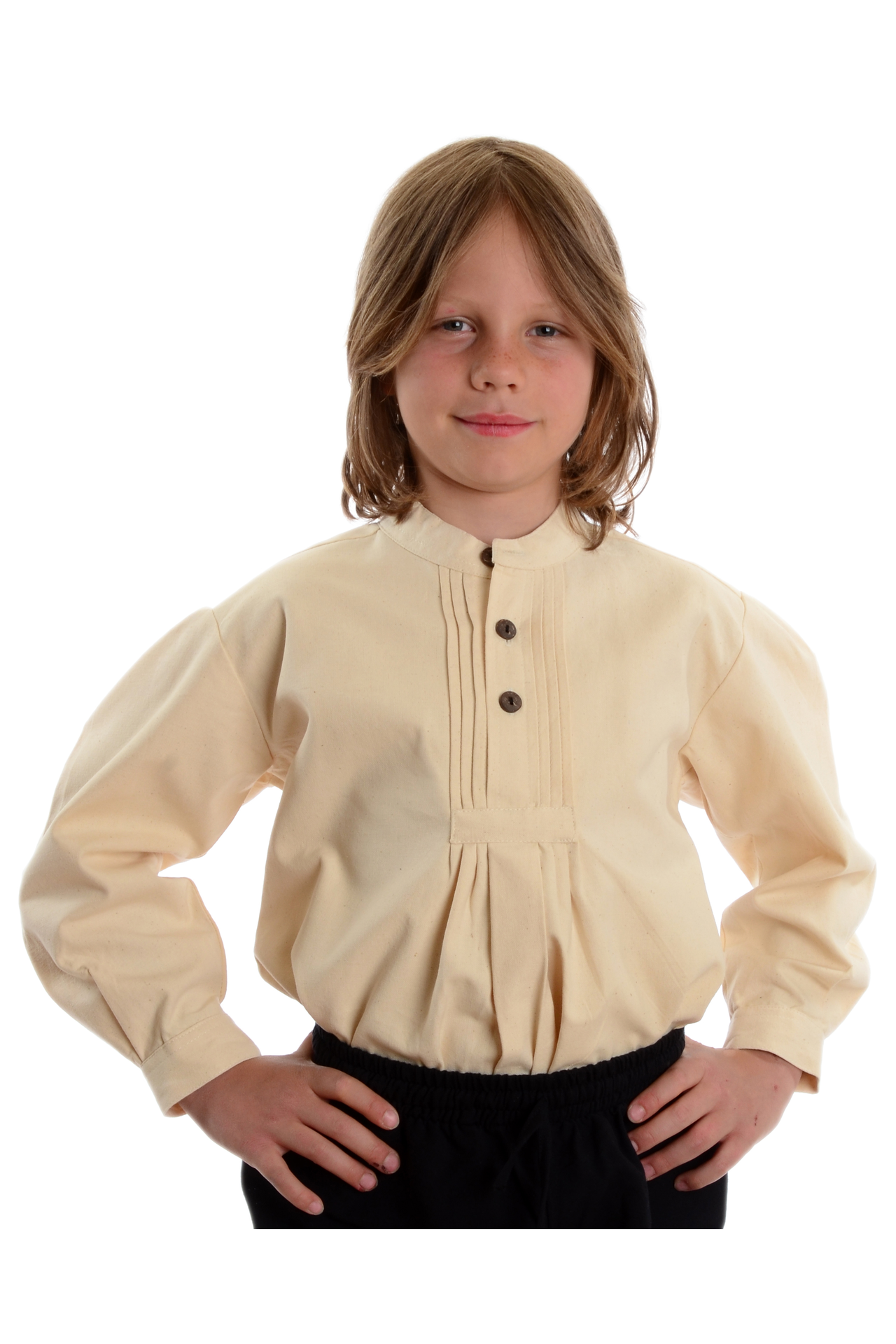 Medieval kids pintuck shirt with stand-up collar and long sleeves. The Kids Shirt Orilus is available in the color beige and the sizes S, M, L, XL, XXL and XXXL. The item is made of cotton and machine washable at 40°C. The Medieval kids shirt comes without accessoires.