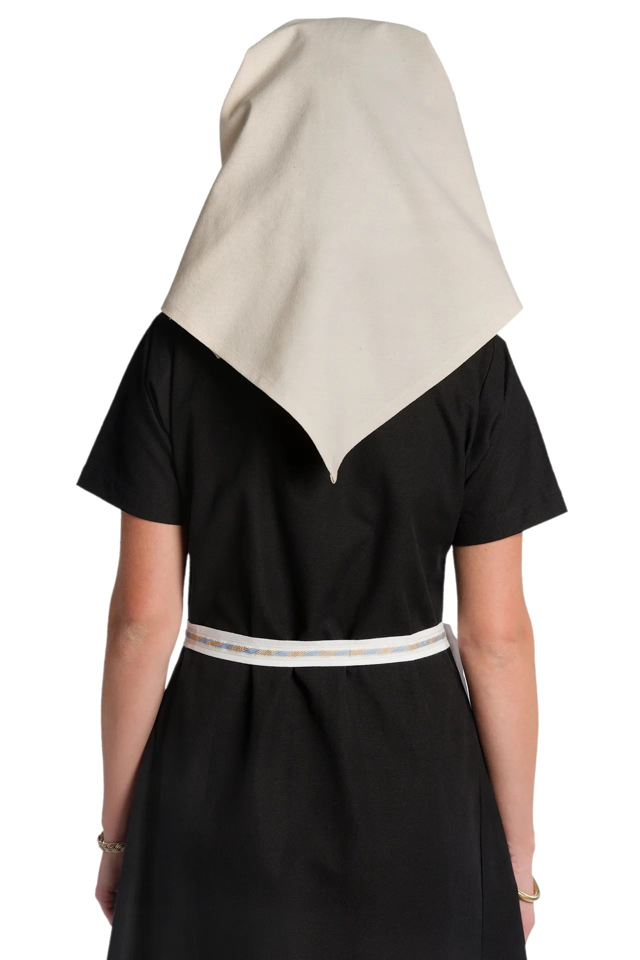 Unsere mittelalterliche Kopfbedeckung "Florimel" ist ein Dreieckstuch mit einer schönen Leinenstruktur. Es wird im Nacken geknotet, um ein Verrutschen zu verhindern und eine individuelle Passform zu gewährleisten.