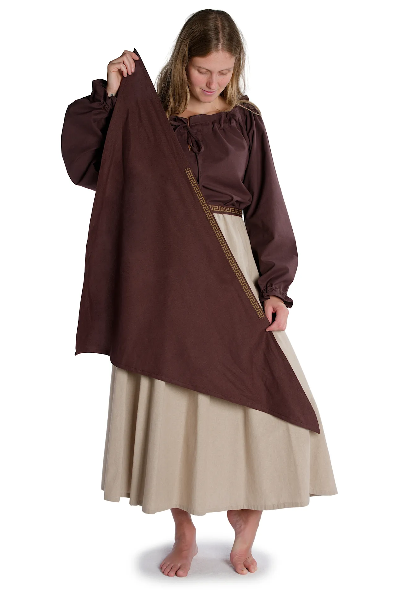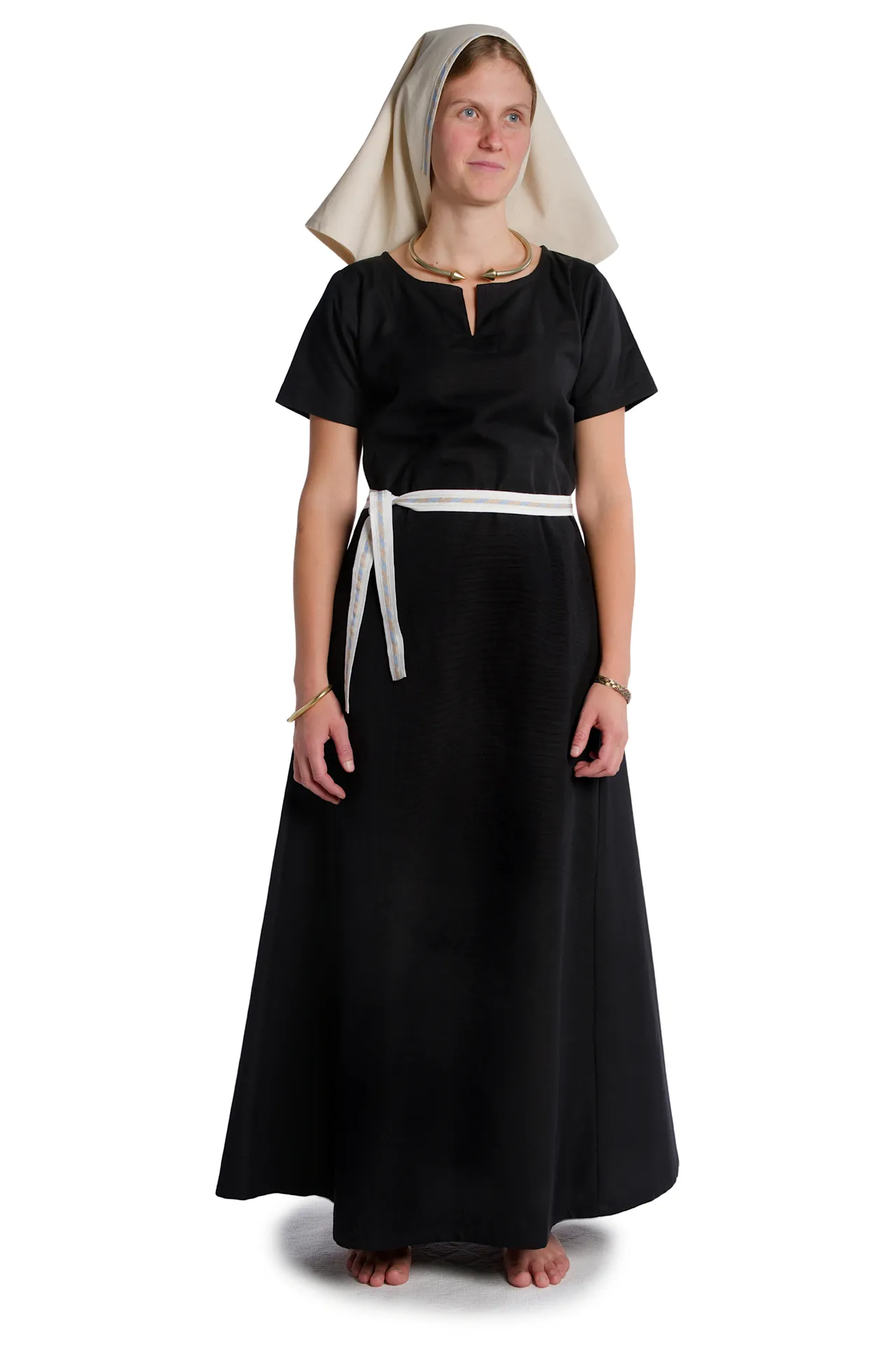 Diese mittelalterliche Kopftuch mit Bodüre "Florimel" besteht aus naturbelassener Baumwolle. Dieses Textil besticht nicht nur mit einem ihrer leichten und feinen Stoffqualität geschuldeten hohen Tragekomfort, sondern auch durch ihre Originalgetreue. Denn die ausschließliche Verwendung von natürlichen Stoffmaterial war typisch für die Epoche des Mittelalters.
