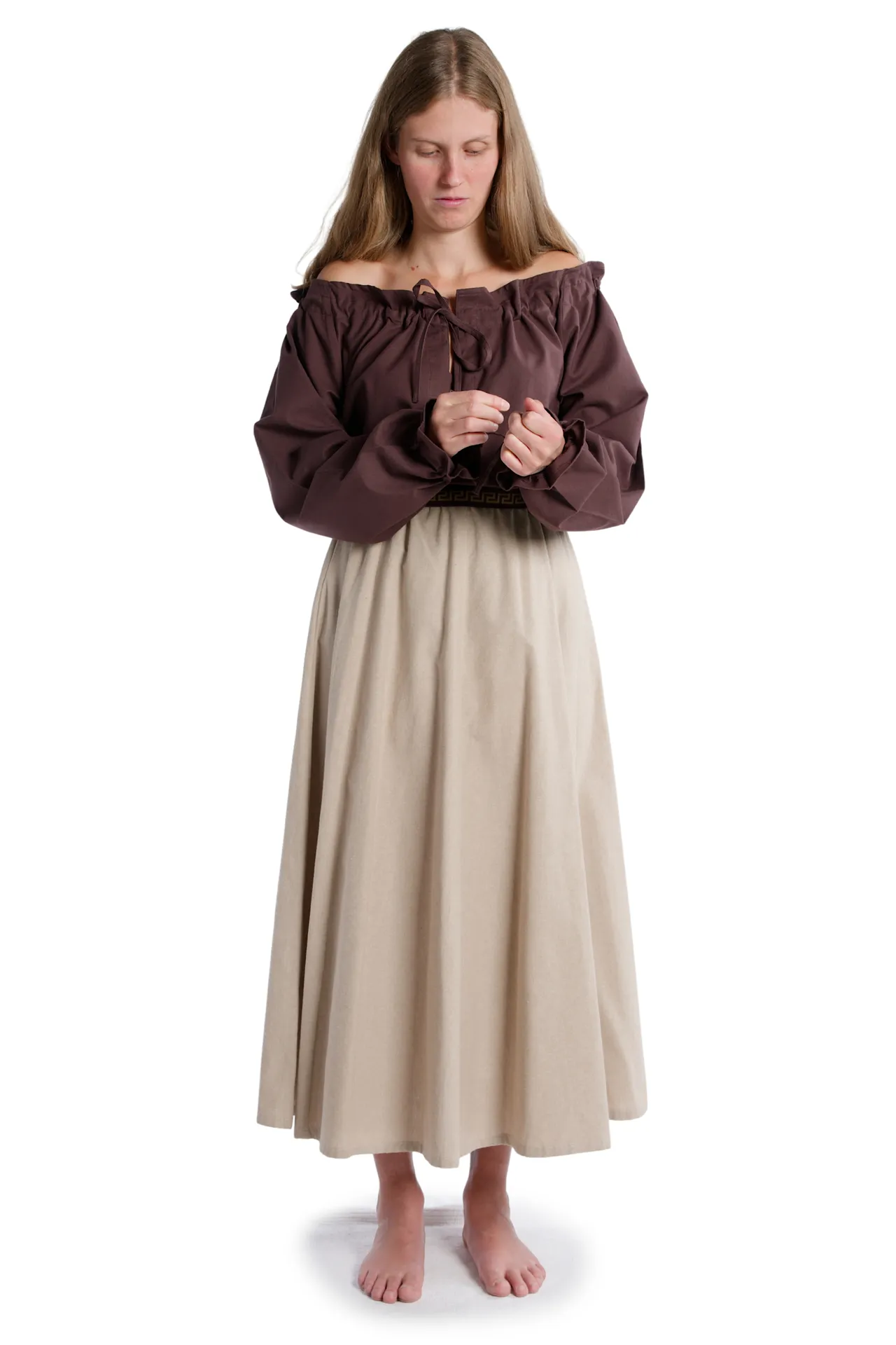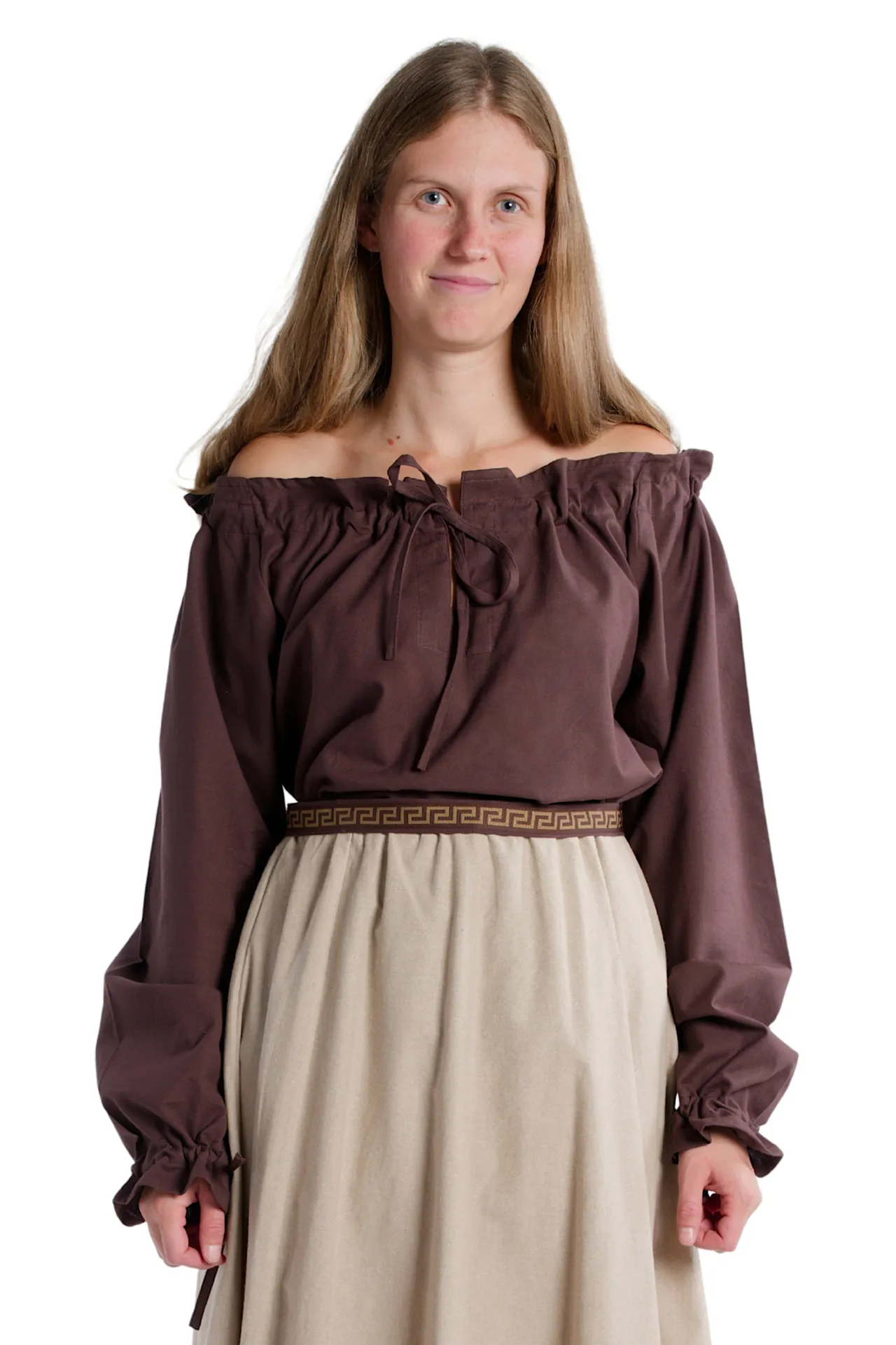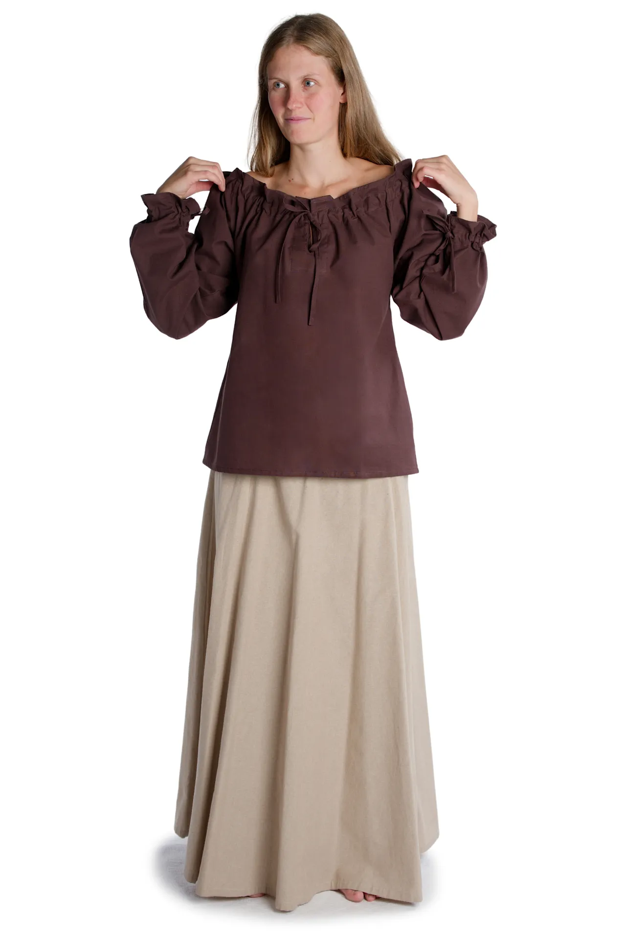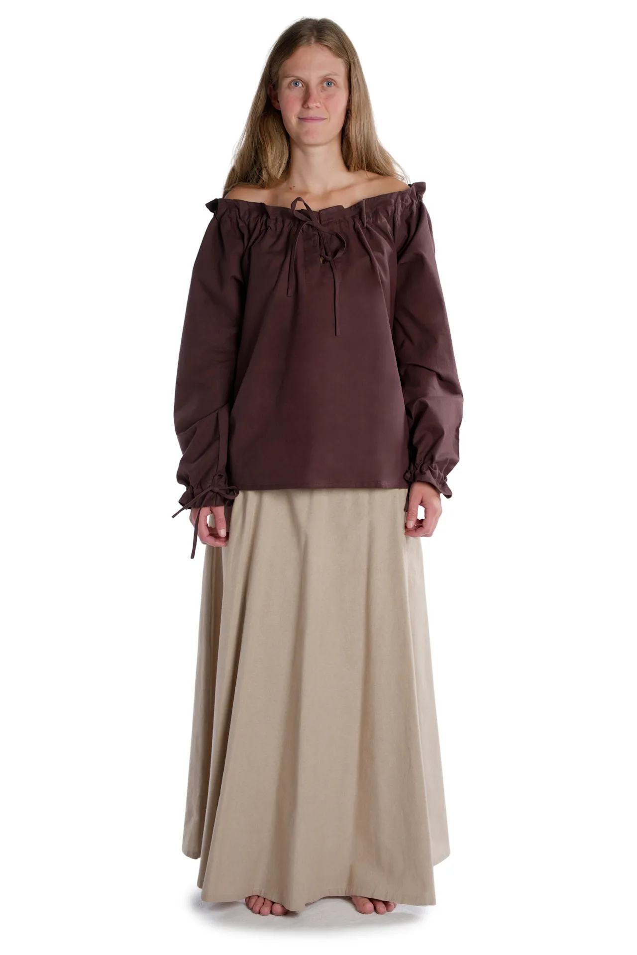 Medieval frilly strapless blouse with v-neck, long sleeves, and laced arm cuff. The Blouse Gotelinde is available in the color beige and the sizes XS, S, M, L, XL, XXL and XXXL. The item is made of cotton and machine washable at 40°C. The Medieval blouse comes without accessoires.