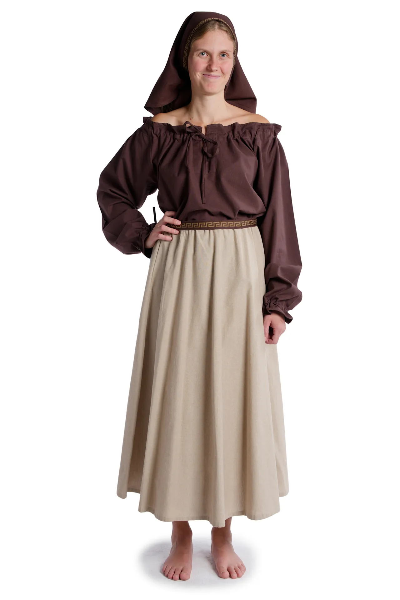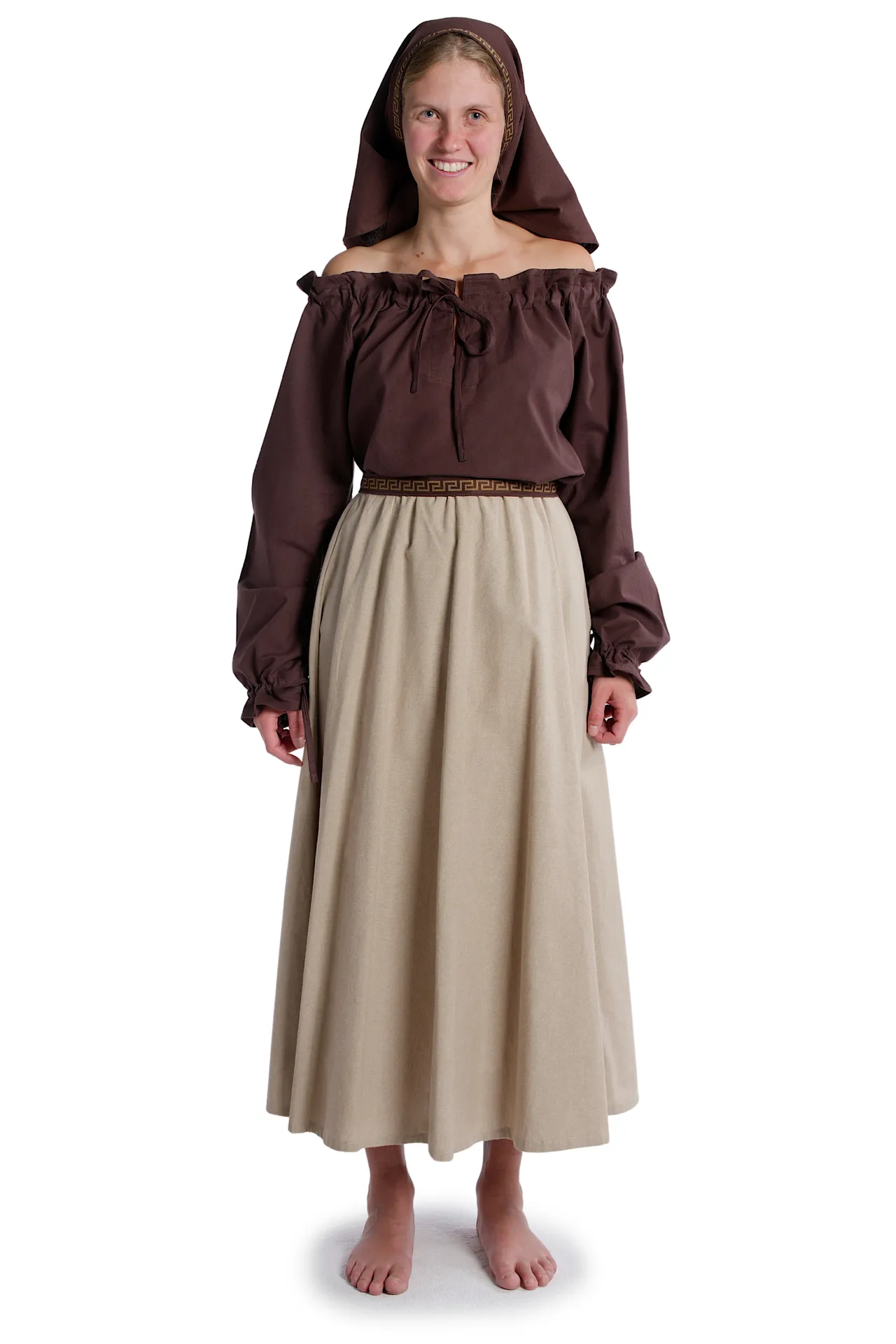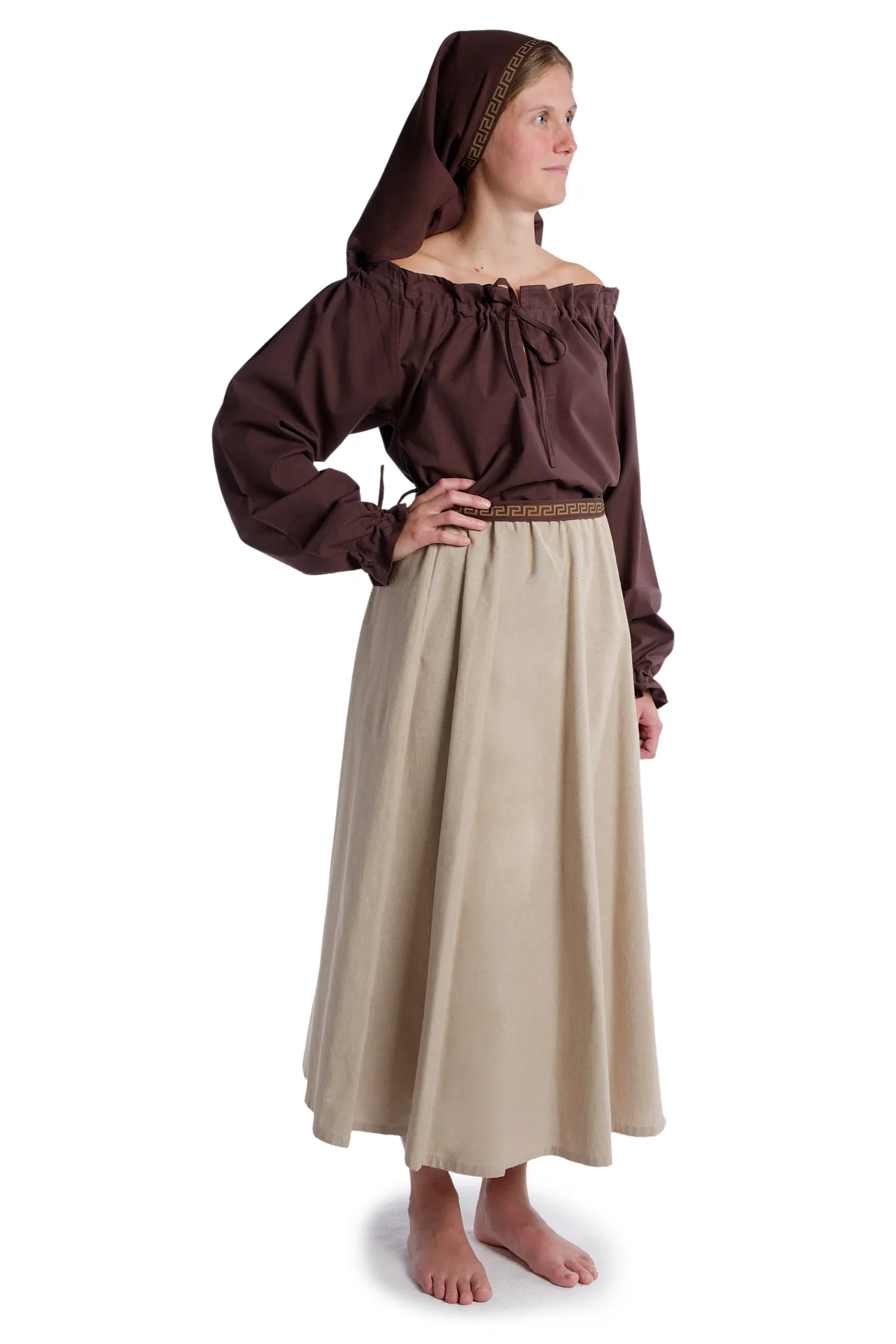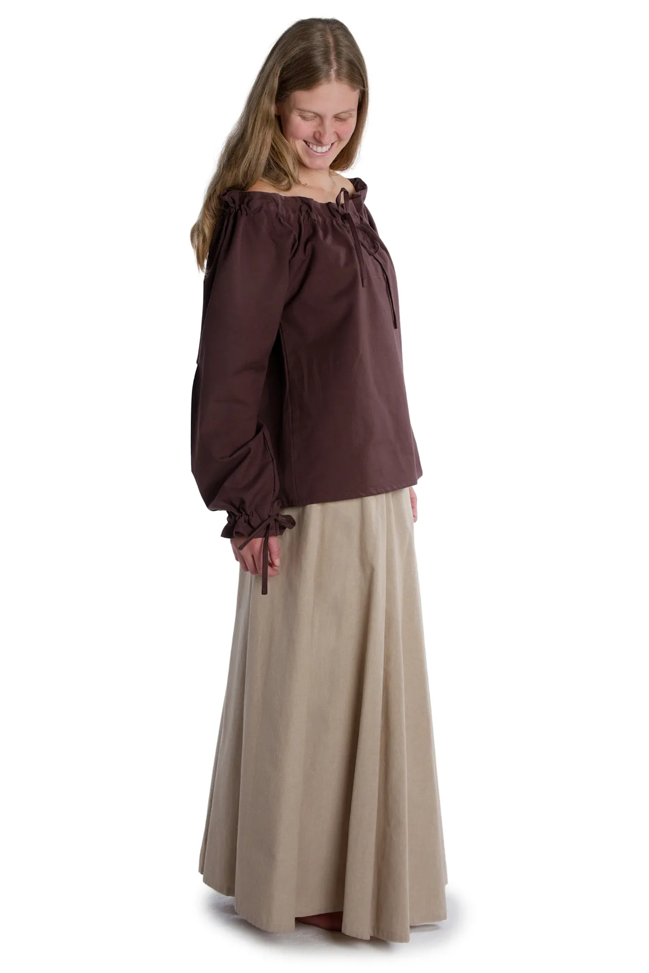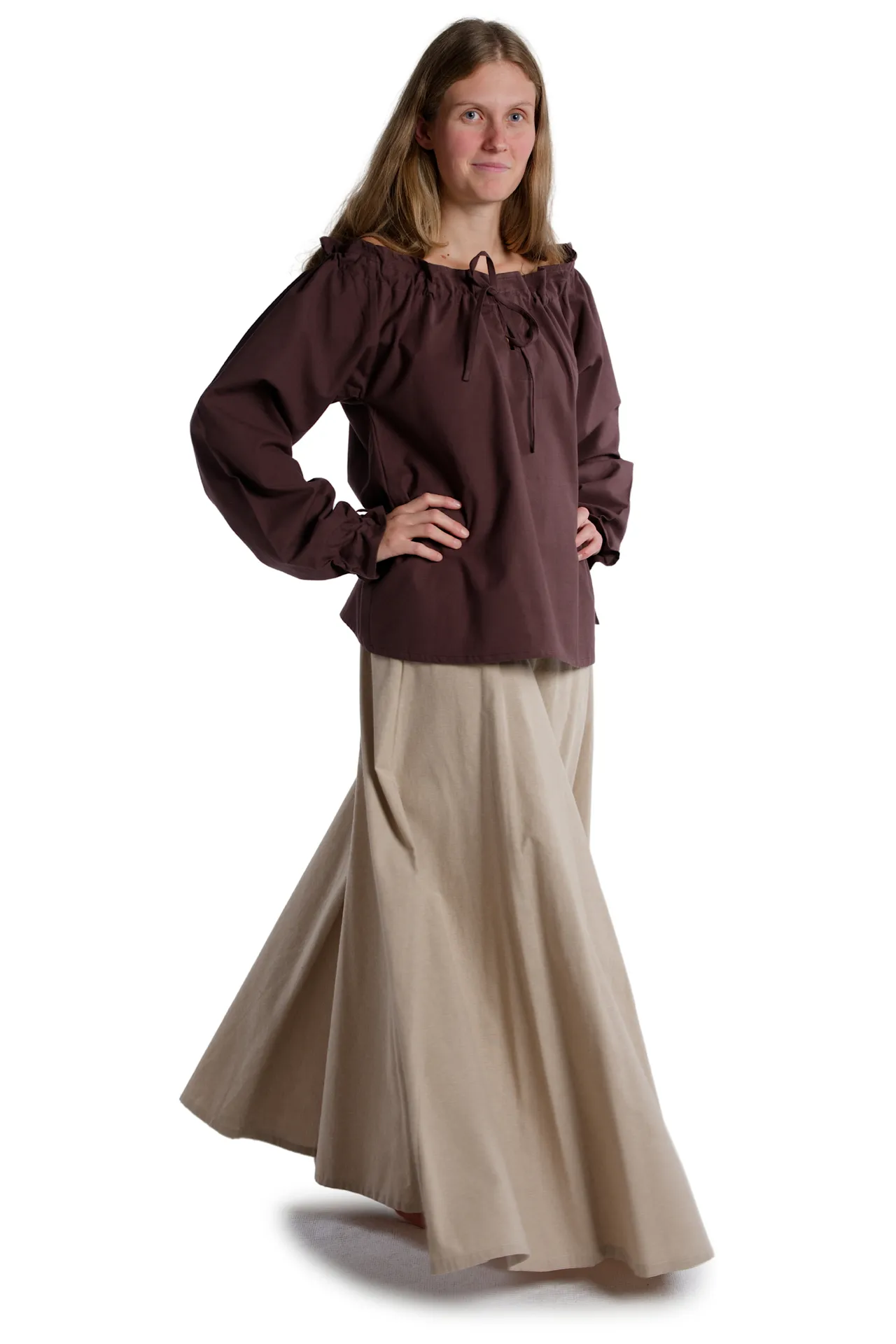 Medieval frilly strapless blouse with v-neck, long sleeves, and laced arm cuff. The Blouse Gotelinde is available in the color beige and the sizes XS, S, M, L, XL, XXL and XXXL. The item is made of cotton and machine washable at 40°C. The Medieval blouse comes without accessoires.