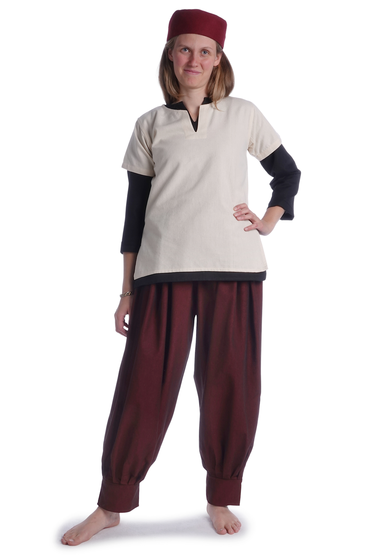 Es ist durch Funde und zeitgenössische Berichte historisch gesichert, dass die Gewandung der Wikingerkrieger auf Hosen basierte. Beispielsweise auf verschiedenen Fundstücken von Oseberg aus dem 9. Jahrhundert oder auf Bildsteinen der Wikingervölker sind Männer in Hosen abgebildet. Grundsätzlich wird zwischen zwei für diese Ära charakteristische Hosenschnitte unterschieden: Zum einen trugen die Wikinger eine am Bein eng anliegende Hosenform, ähnlich der germanischen Thorsberg-Hose aus dem 4. Jahrhundert, und zum anderen die hier umgesetzte Hosenform der weiten Pumphose, die an den Waden eng anliegt. Als Vorbild für unsere Hose „Eydisi“ diente der Oseberg-Teppich. Er zeigt eine weite, bis über die Knie pludernde Pumphose, welche aber an den Unterschenkeln bis zum Knöchel eng am Bein anlag, was wohl durch Wadenbinden oder Strümpfe erzielt wurde. Auch beispielsweise unter den Haithabu-Relikten befinden sich Überreste dieser Hosenart. Somit gilt dieses am Oberschenkel großzügig geschnittene und am Unterschenkel eng anliegende Modell als kennzeichnend für die Damenbekleidung der Wikinger.