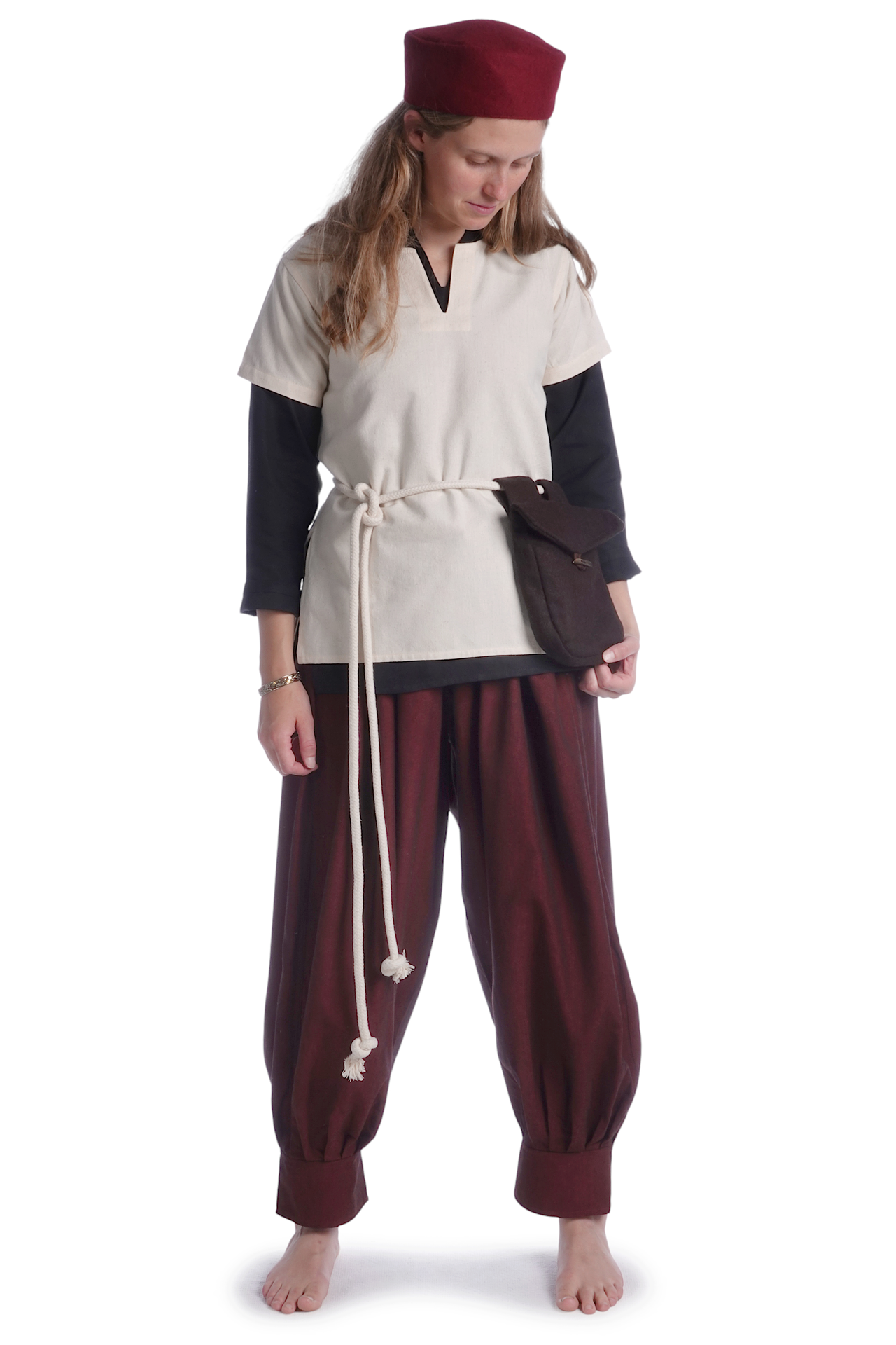 Unsere Hose „Eydis“ ist maßgeblich für die Kleidung der Wikinger, den nordischen und baltischen Volksstämme des Nord- und Ostseeraums im frühen Mittelalter (zwischen 800-1050). Die historisch authentische Wikingerhose verfügt über die für die Wikingerzeit typische engen Bund oberhalb der Knöchel, die Beine sind in ein weitem, verfüllenden und wärmenend Stoff gekleidet.Die Hose Modell "Eydis" ist pludernd und weit geschnitten, was ebenfalls kennzeichnend für die Wikinger-Hosenmode ist. An der Taille befinden sich Gummizug und Schnürung. Darüber hinaus ermöglicht der großzügige Schritt völlige Bewegungsfreiheit. Durch den weiten Schnitt, den Gummizug ist die Hose für jeden Figurentyp geeignet.