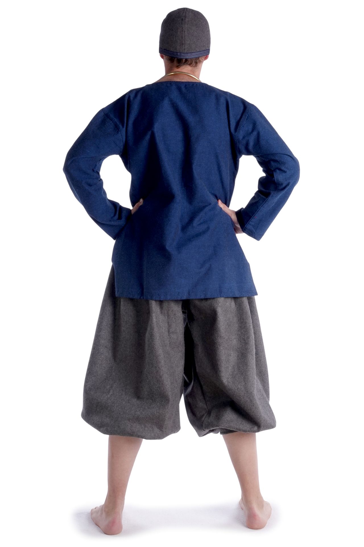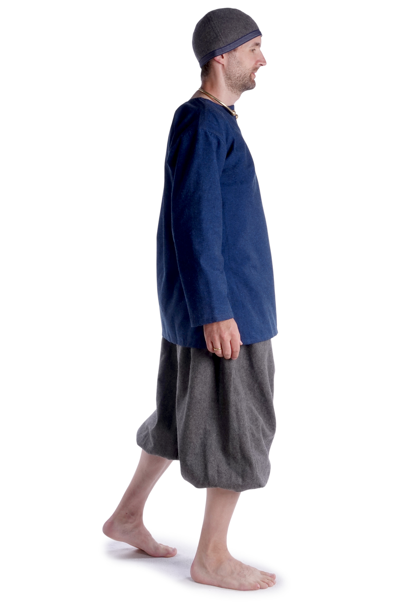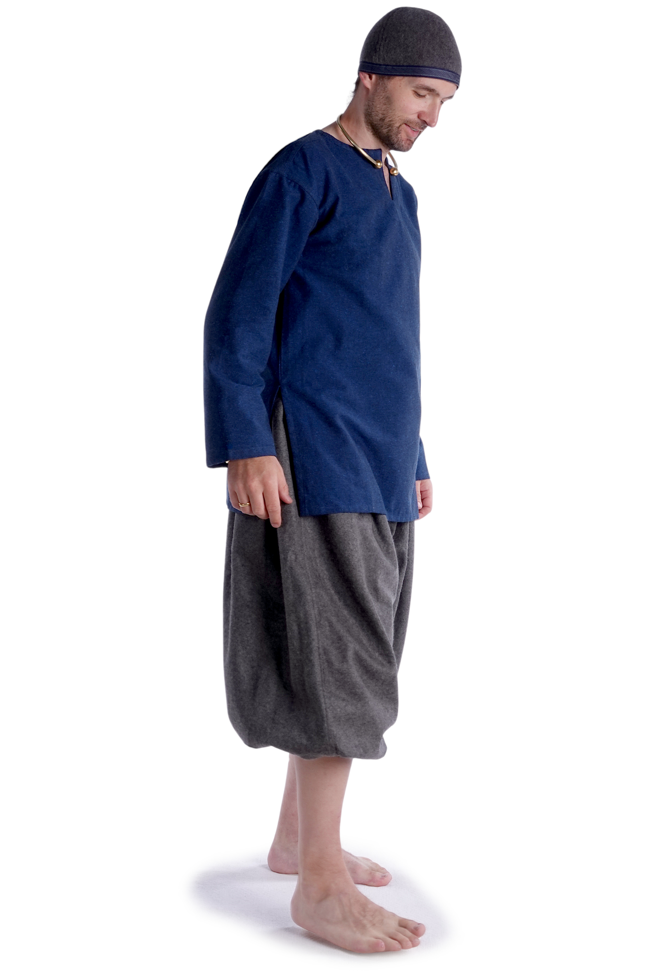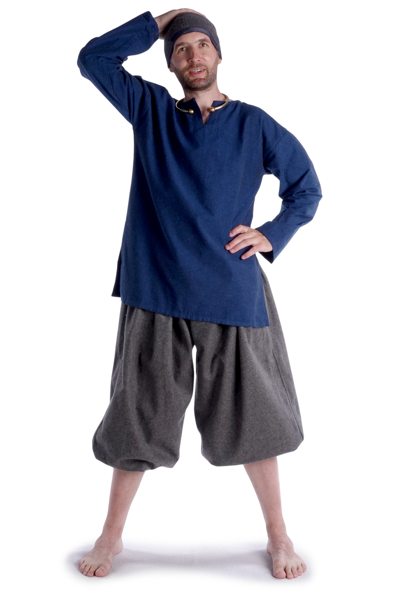 Es ist durch Funde und zeitgenössische Berichte historisch gesichert, dass die Gewandung der Wikingerkrieger auf Hosen basierte. Beispielsweise auf verschiedenen Fundstücken von Oseberg aus dem 9. Jahrhundert oder auf Bildsteinen der Wikingervölker sind Männer in Hosen abgebildet. Grundsätzlich wird zwischen zwei für diese Ära charakteristische Hosenschnitte unterschieden: Zum einen trugen die Wikinger eine am Bein eng anliegende Hosenform, ähnlich der germanischen Thorsberg-Hose aus dem 4. Jahrhundert, und zum anderen die hier umgesetzte Hosenform der weiten Pumphose, die an den Waden eng anliegt. Als Vorbild für unsere Hose „Odini“ diente der Oseberg-Teppich. Er zeigt eine weite, bis über die Knie pludernde Pumphose, welche aber an den Unterschenkeln bis zum Knöchel eng am Bein anlag, was wohl durch Wadenbinden oder Strümpfe erzielt wurde. Auch beispielsweise unter den Haithabu-Relikten befinden sich Überreste dieser Hosenart. Somit gilt dieses am Oberschenkel großzügig geschnittene und am Unterschenkel eng anliegende Modell als kennzeichnend für die Herrenbekleidung der Wikinger.