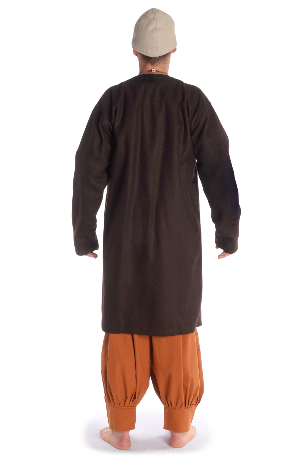 Unser mittelalterliches, mantelartiges Obergewand ist als Wikinger-Mantel konzipiert. „Vidar“ hat lange Ärmel, reicht bis zum Knie und ist frontal offen, wobei die Säume der Vorderseite entlang des Brust-und Halsausschnitt mit einer schwarzen Bordüre eingefasst sind. Falls der Mantel mit Gürtel oder Schnur getragen wird, ergibt sich ein V-förmiger Halsausschnitt. Das Innenfutter aus Baumwolle ist etwas heller als das Obermaterial.