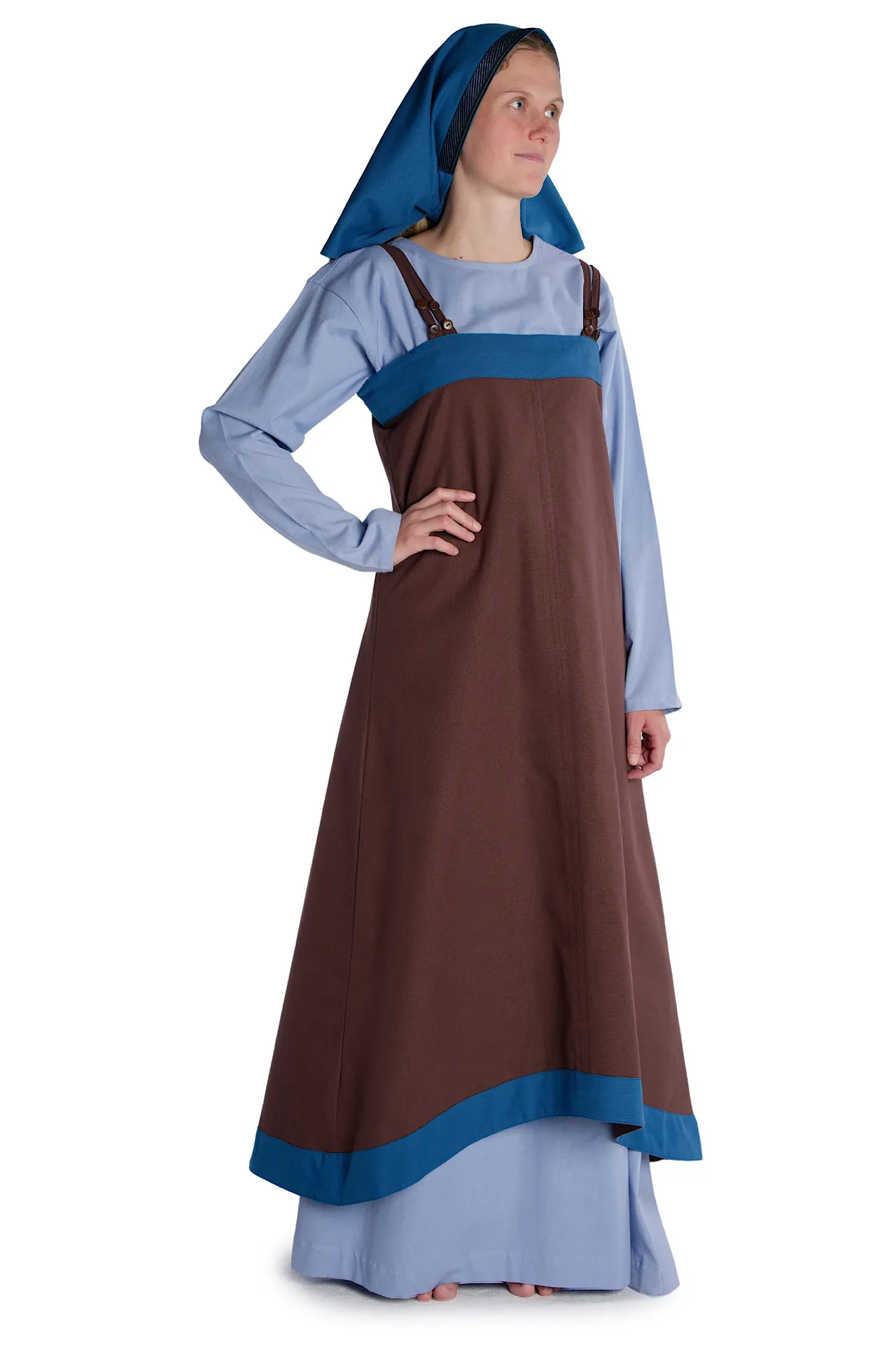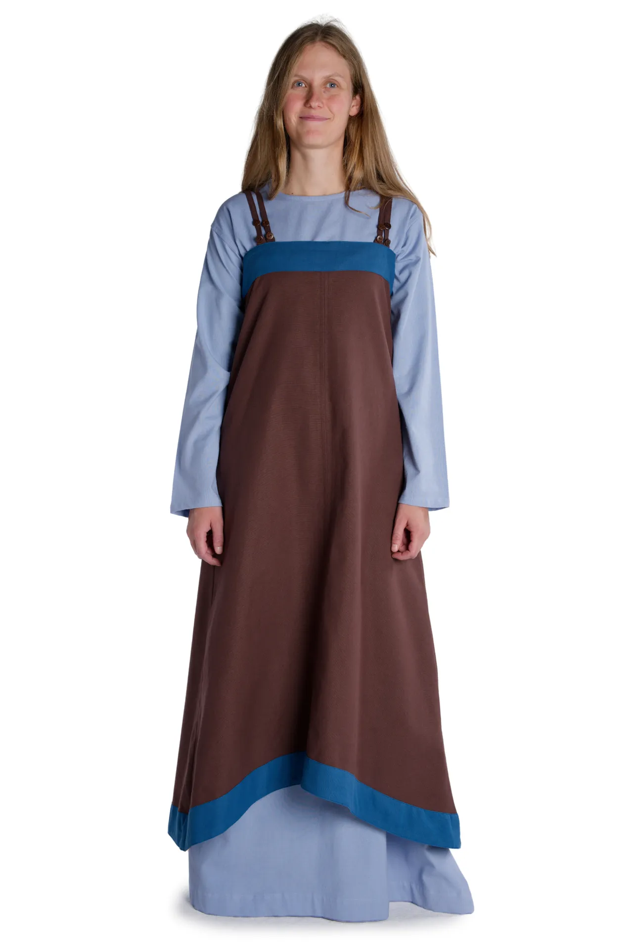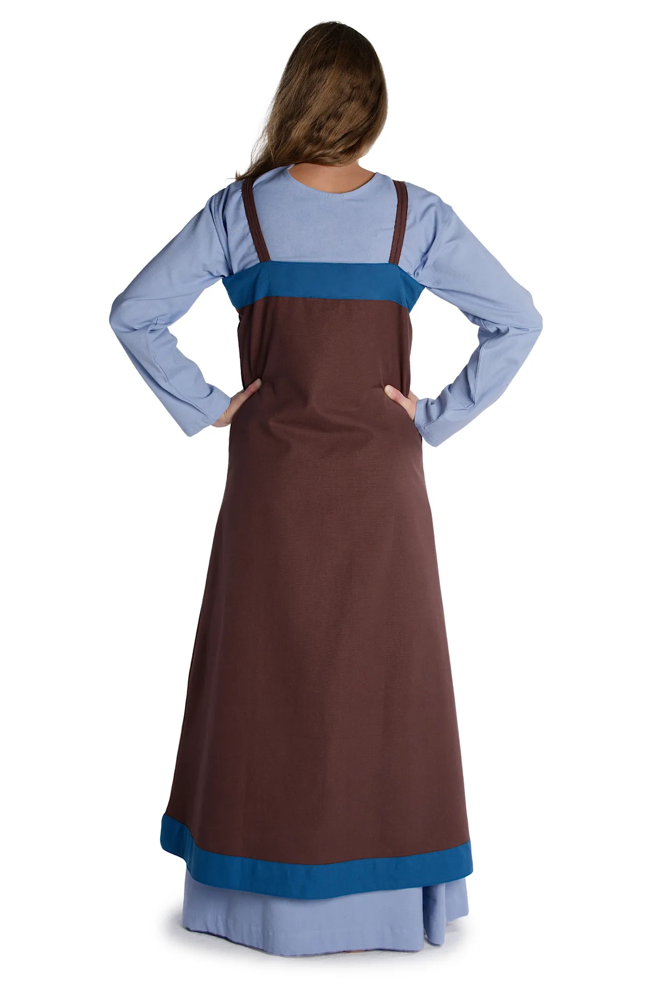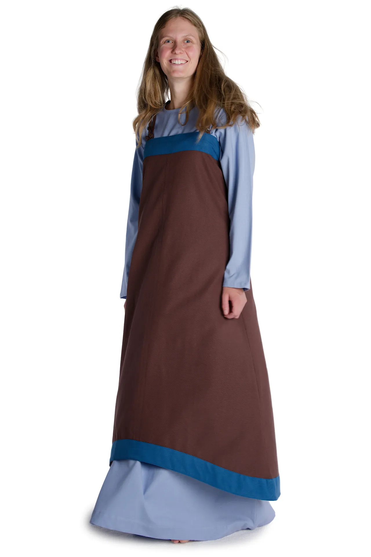 Für die Damengewandung der Wikinger (ca. 750 – 1050), wie auch des gesamten Mittelalters, sind Oberkleider - die sog. Surkots - typisch, die über dem Unterkleid (beispielsweise Kleid „Verandi“ unseres Sortiments) getragen wurden. Das für die Frauenkleidung der nordeuropäischen und baltischen Volksstämme des Frühmittelalters typische Obergewand wird als Hängerock, Trägerkleid oder auch Trägerschürze der Wikingerinnen bezeichnet. Die archäologischen Textilfunde der Wikingerstädte Birka (8. – 10. Jahrhundert) und Haithabu (9. – 11. Jahrhundert) belegen dieses geschichtlich authentische Kleidungsstück. Dieses Kleidungsstück war ärmellos, fußlang und rundum geschlossen. An den Schultern wurde die Trägerschürze mittels Schulterbändern und Fibeln gehalten. Weiterhin war der Hängerock oben röhrenartig geschnitten und wurde nach unten hin immer weiter. Außerdem ließ das Trägerkleid der Wikingerdamen auf der Vorderseite den Blick auf das Unterkleid zu.